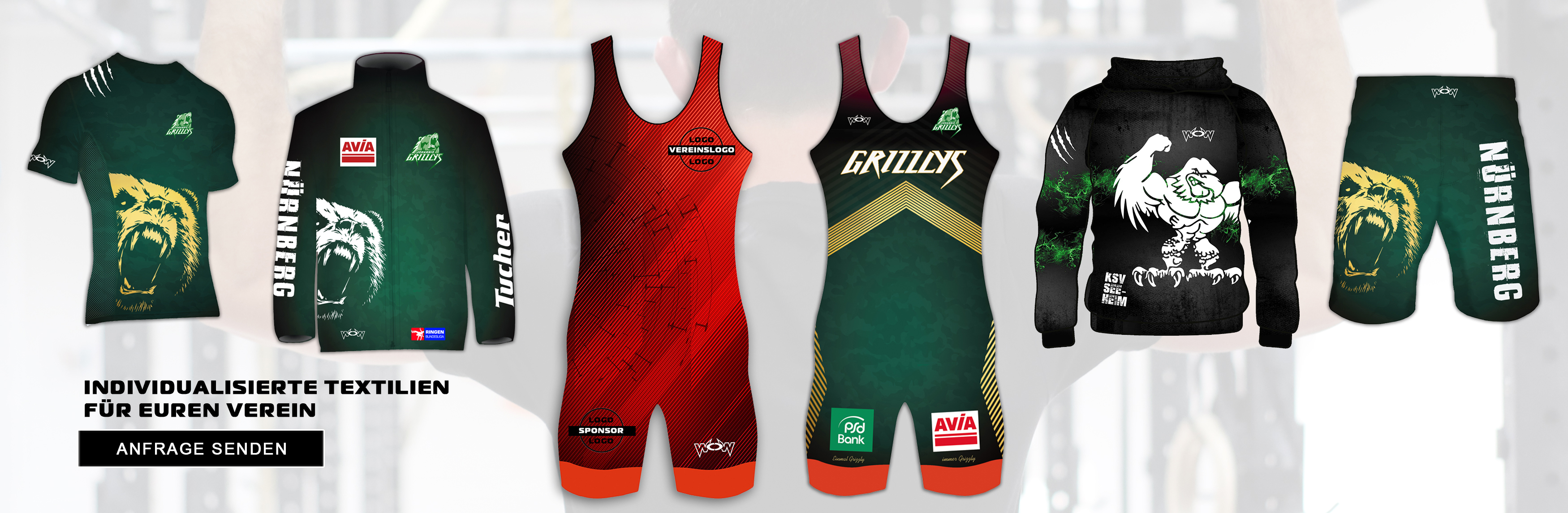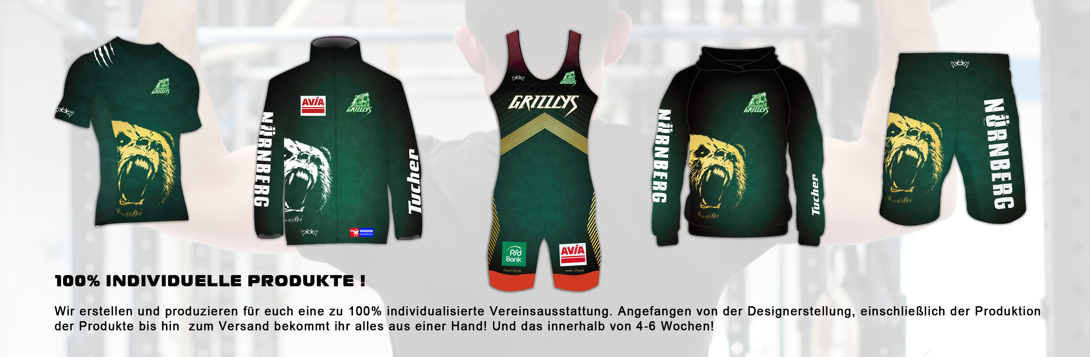 Ihr könnt dazu aus einer breiten Produktpalette auswählen, die wir permanent erweitern. Für unsere Produkte haben wir nur die besten Stoffe ausgewählt und die Schnitte so angepasst, dass sie die höchsten sportlichen Ansprüche erfüllen. Die Mindestbestellmenge liegt bei den meisten Produkten mai bei insgesamt 10 Stück (unabhängig der Anzahl der Großsen).